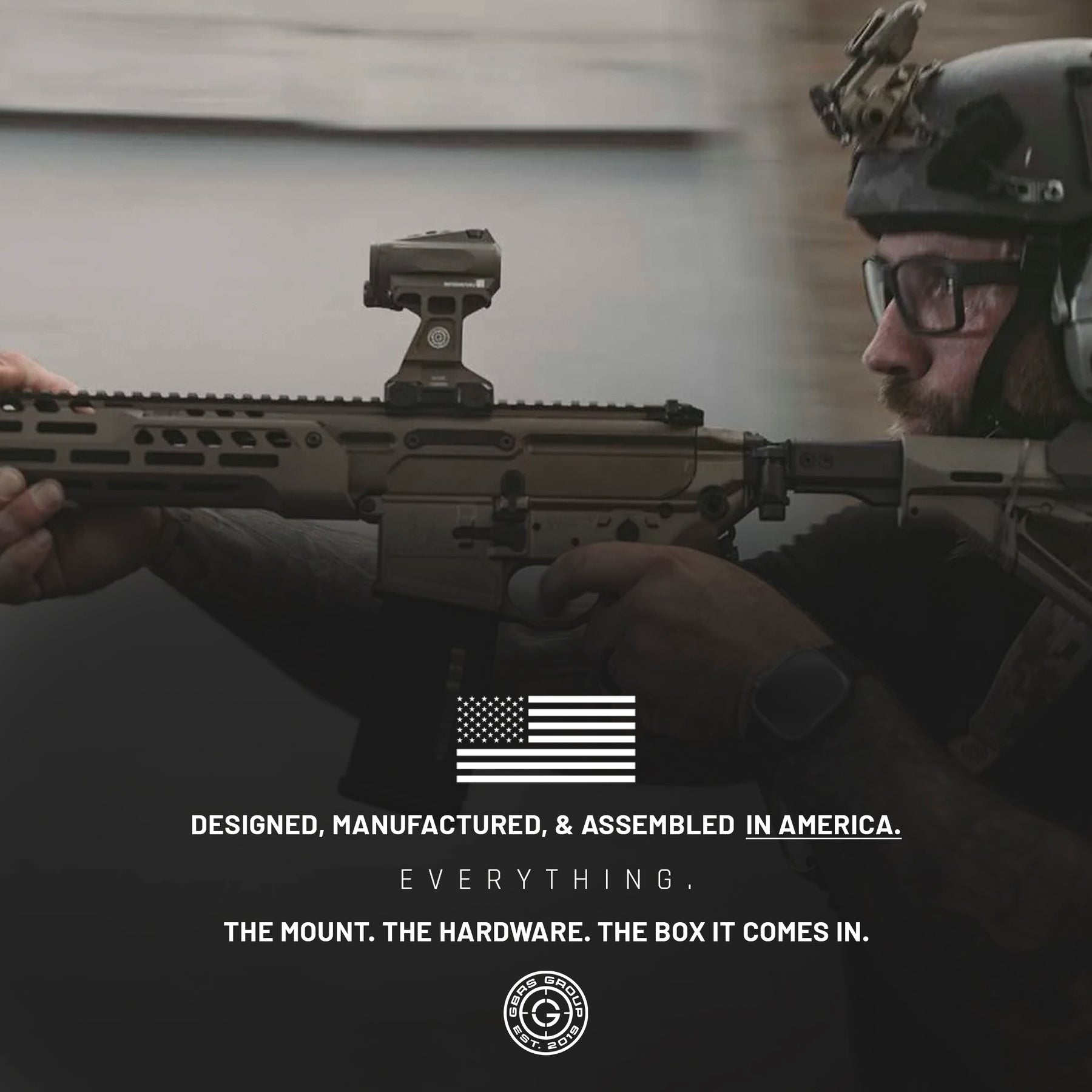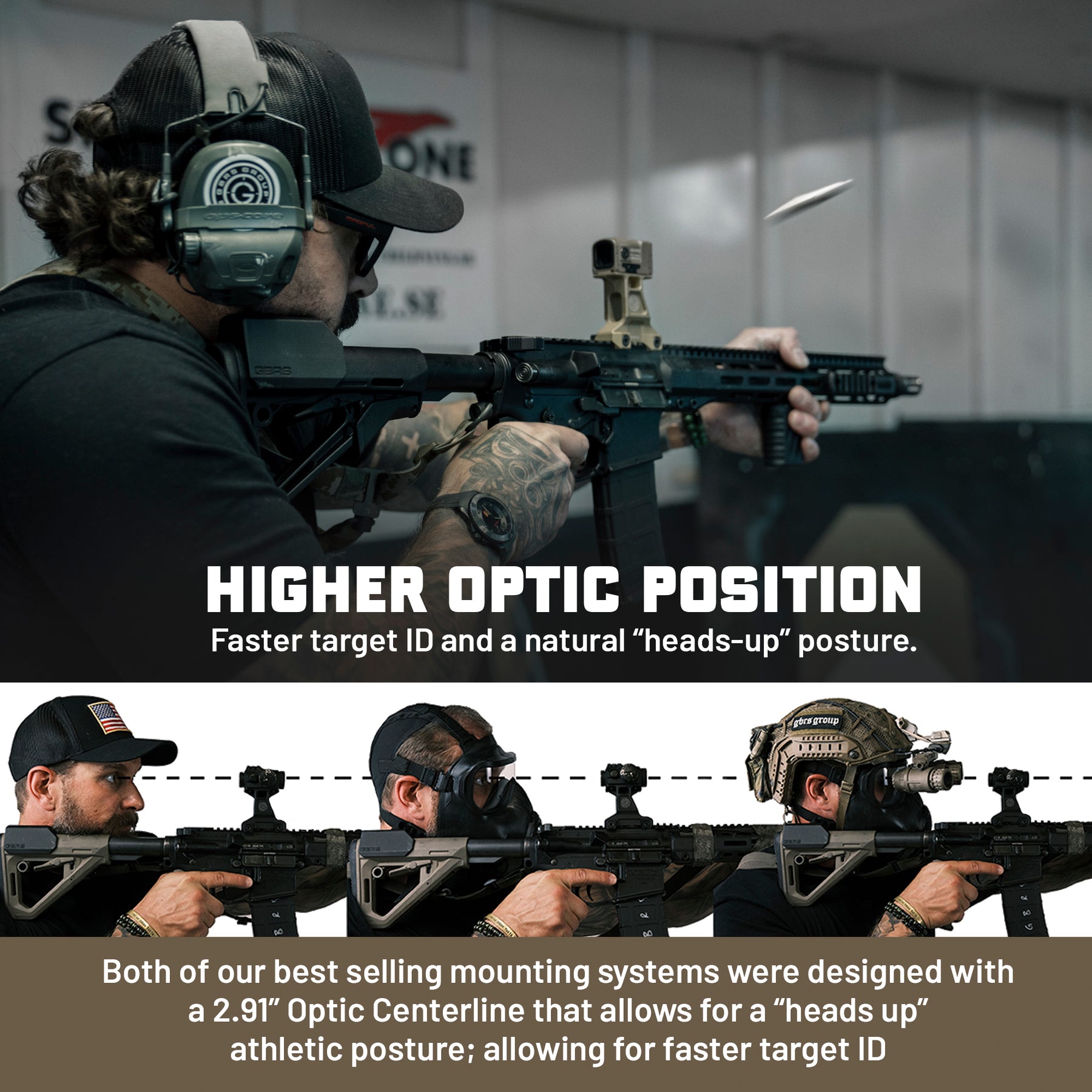 Lerna is the first stand-alone optic mount designed with a 2.91” Optic Centerline for faster target ID, regardless of equipment obstructions such as EarPro/Comms headsets, Gas masks/CBRN, and Night vision use.