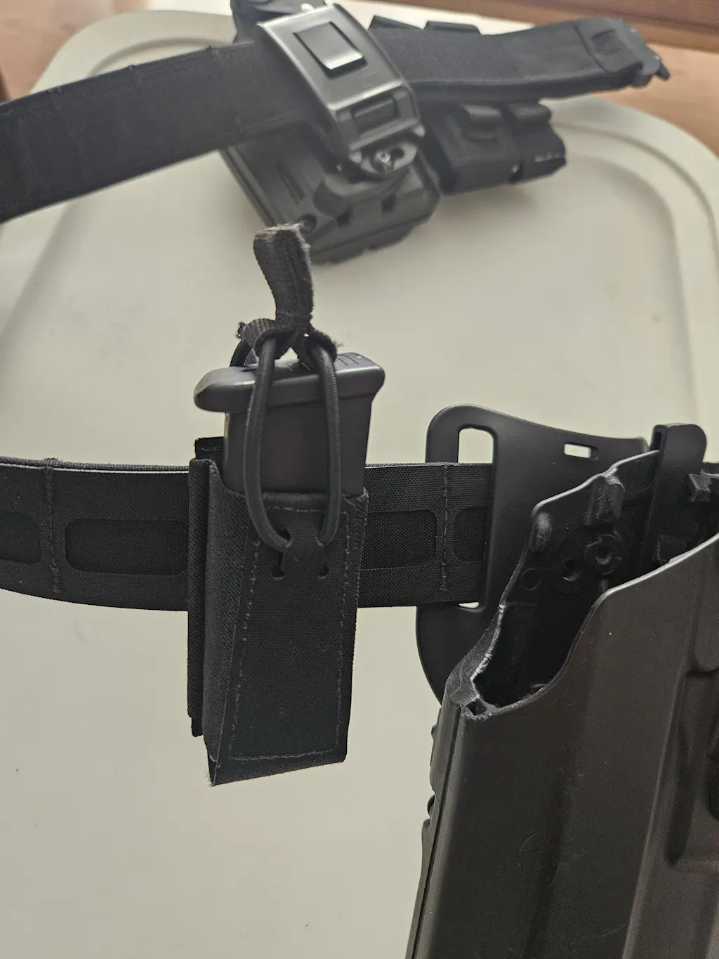 The laser cut squadron laminate and 3” heavy poly elastic material allow for a smooth draw, positive retention and easy magazine reholster.