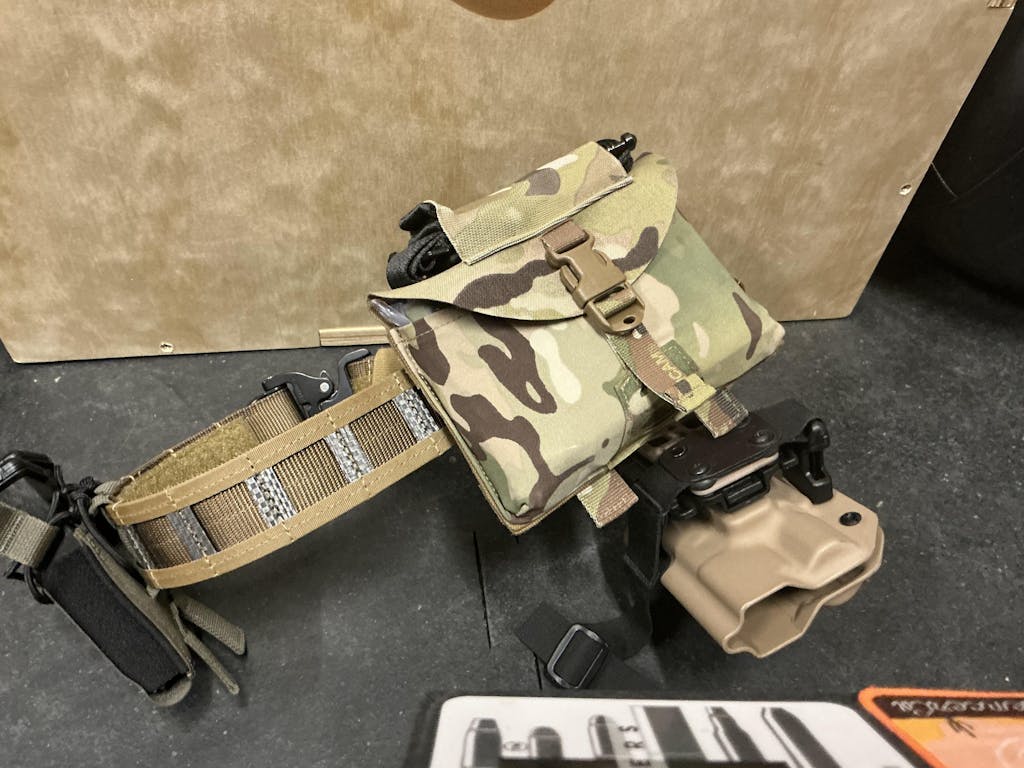 GBRS Group IFAS (Individual First Aid System) Pouch - Showing on a belt, laying on a table, ready to fill