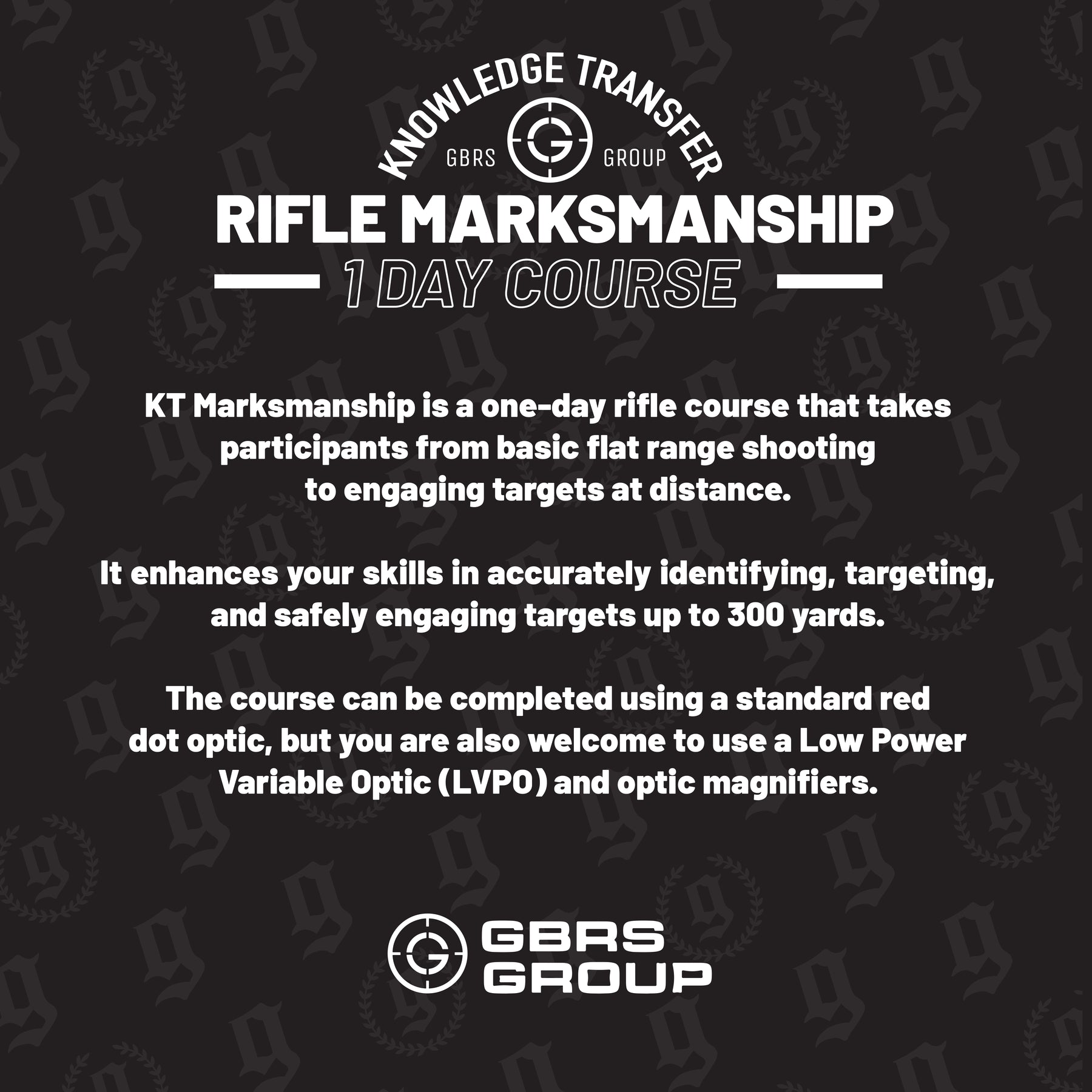 GBRS Knowledge Transfer (KT) Courses are a bespoke package tailored to deliver effective, real-world training to its participants. With decades of hard-fought lessons at the Tier 1 level, the Cadre’s objective is simple: provide Experience-Based Solutions to the end-user to upskill the tactical community and add value to those with shared beliefs. These courses will be available several times a year and are based on an open enrollment model.