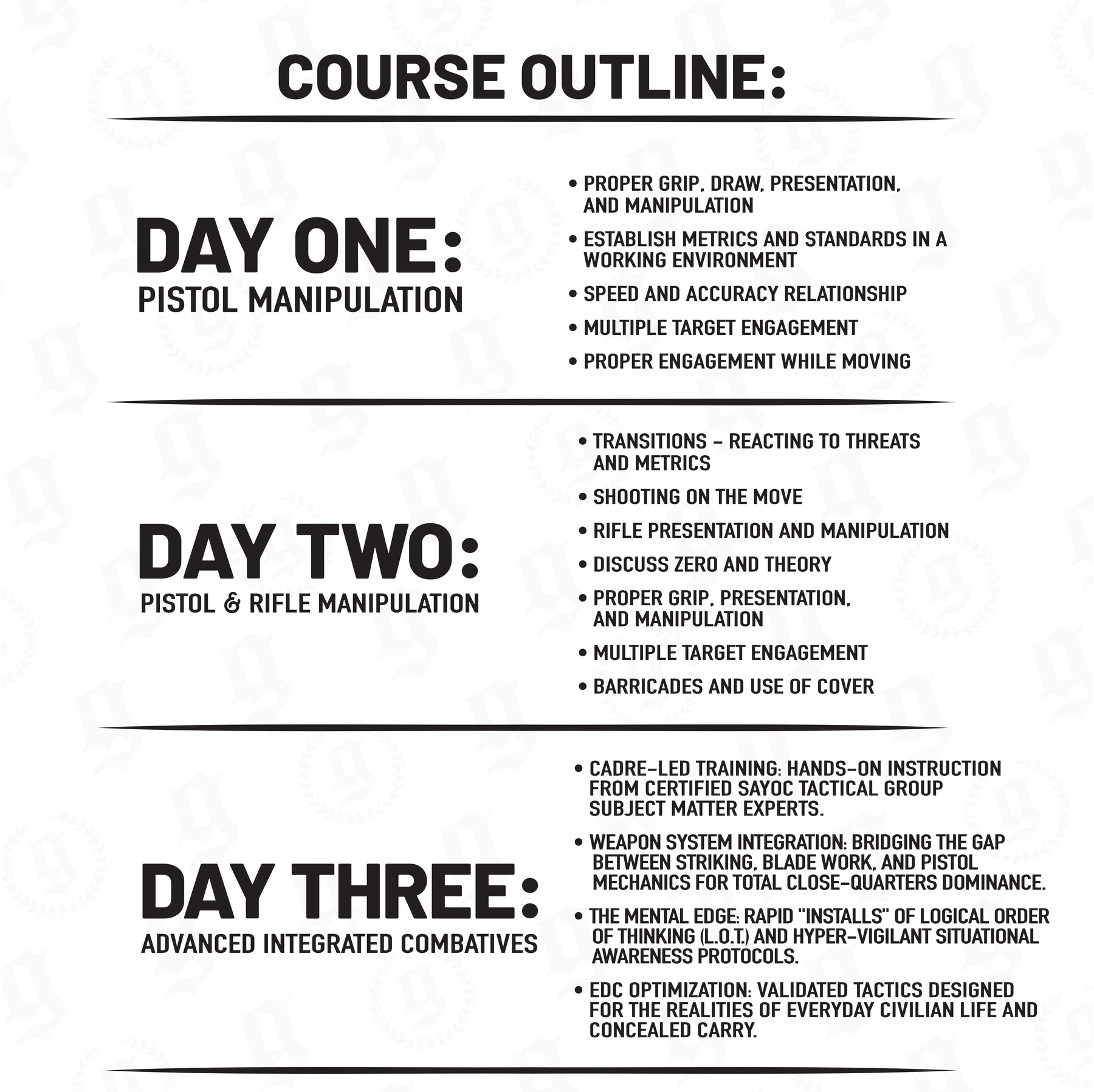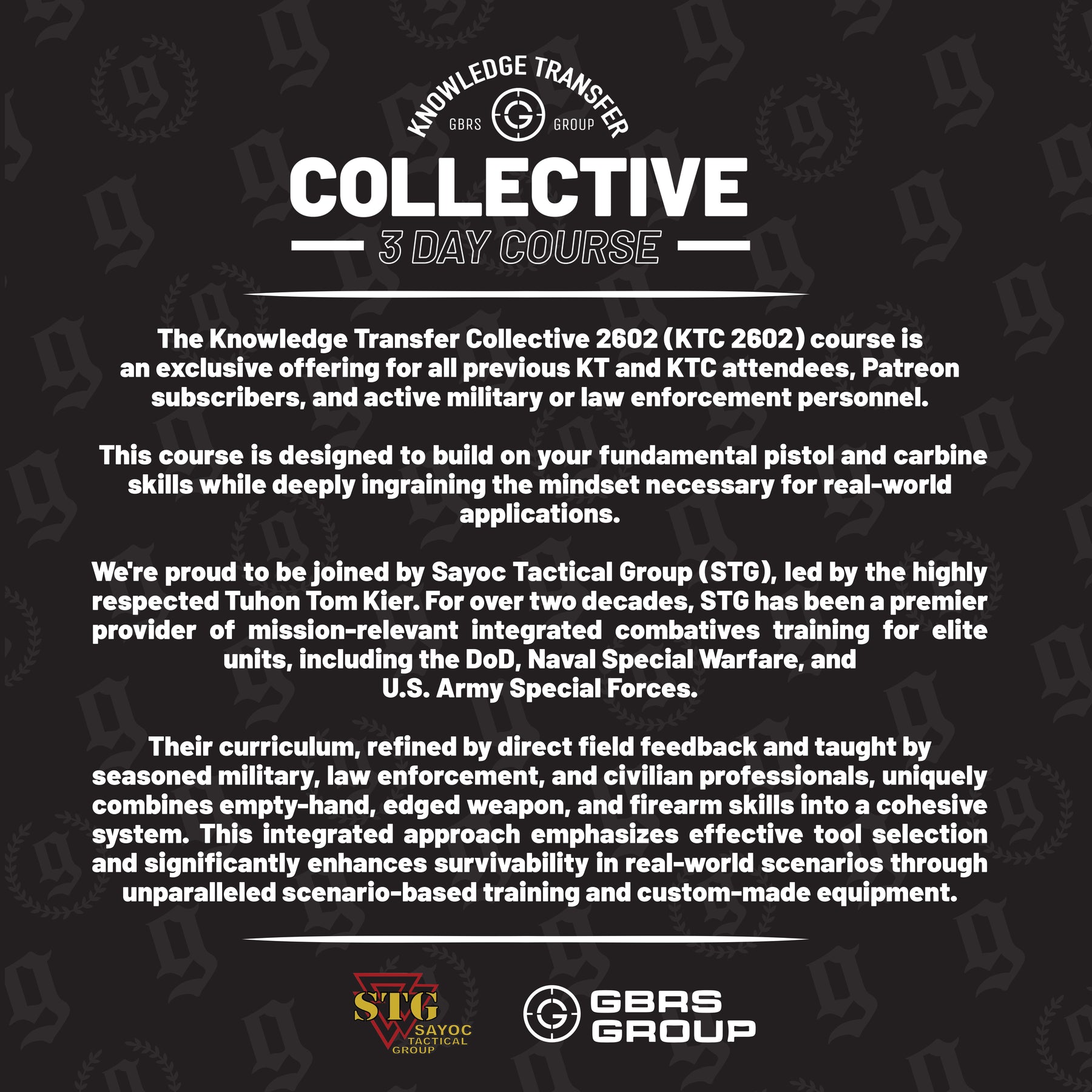 Knowledge Transfer Collectives (KTC) is an all-encompassing 3-5 day courses developed to immerse participants in the perfect training day. Each morning starts with fitness, incorporating key movements to help initiate the mind-body connection. The group then breaks to prepare for a full day of flat-range instruction that spans fundamentals to USPSA-style courses of fire, and will build on the fundamentals of pistol and carbine while instilling the mindset for real-world applications. The day concludes with a fireside debrief, and each meal catered by a hired chef.