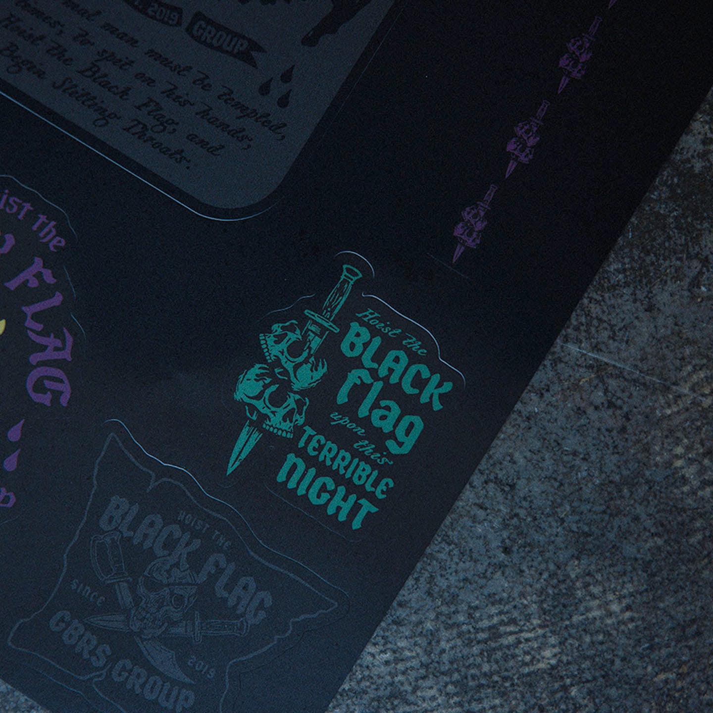 GBRS Group Black Flag Sticker Sheet - Pictured showing the Terrible Night sticker design