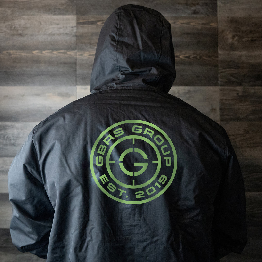 Water resistant (Level 3) shell features a full back GBRS Group logo design and an adjustable mesh lined, 3-panel hood.