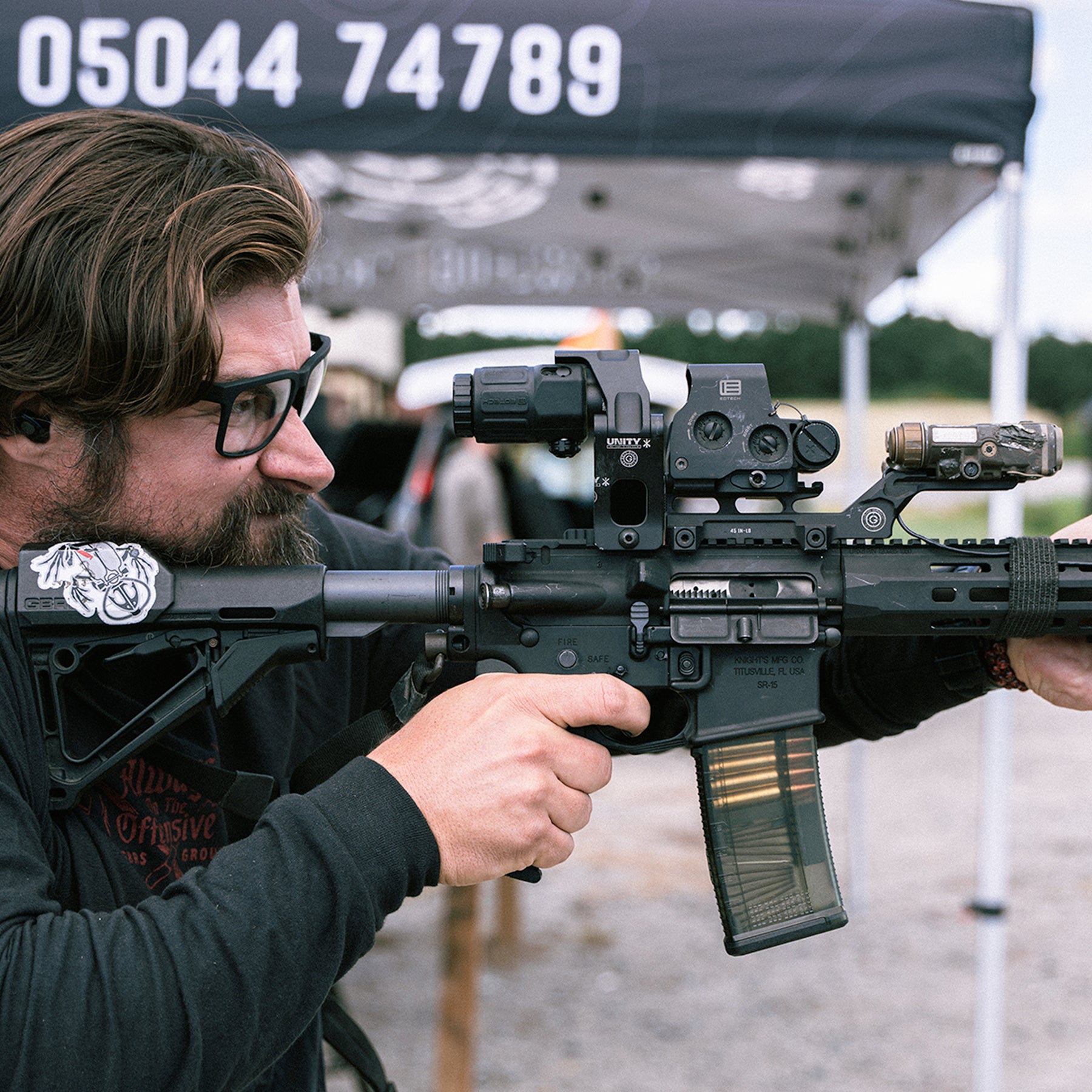 A higher optic allows for a more athletic “Heads-up” posture that enables you to maintain a vertical spine which translates to body armor or “presenting plates” to the threat. This “Heads-up” style allows for faster processing speed and increased situational awareness.