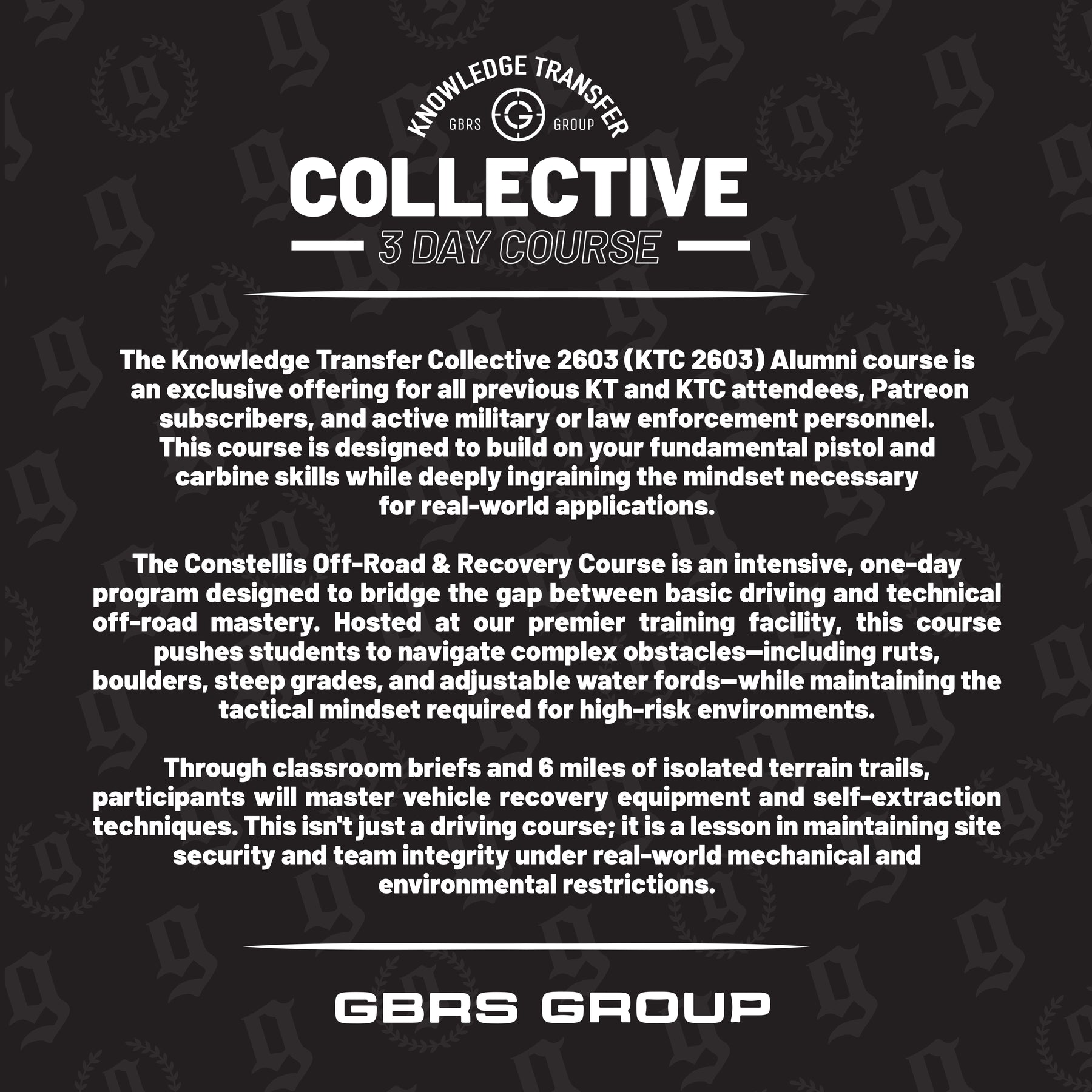 Knowledge Transfer Collectives (KTC) is an all-encompassing 3-5 day courses developed to immerse participants in the perfect training day. Each morning starts with fitness, incorporating key movements to help initiate the mind-body connection. The group then breaks to prepare for a full day of flat-range instruction that spans fundamentals to USPSA-style courses of fire, and will build on the fundamentals of pistol and carbine while instilling the mindset for real-world applications. The day concludes with a fireside debrief, and each meal catered by a hired chef.